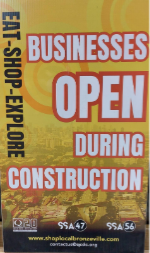 - “Businesses Open During Construction” signage posted to encourage continued consumer traffic